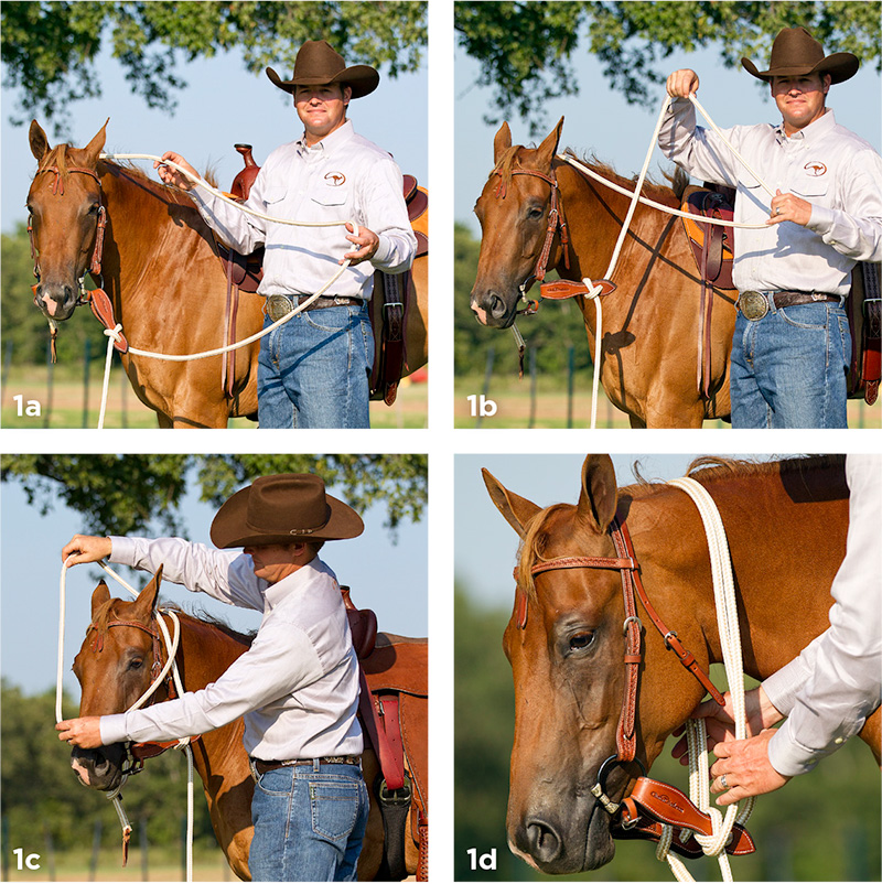 STEP 1: Pull the reins to the left side of the horse’s neck (1A) and make a figure 8 in the reins (1B). Pull the loop over the horse’s head (1C) and adjust so that the reins are in four equal lengths (1D).
