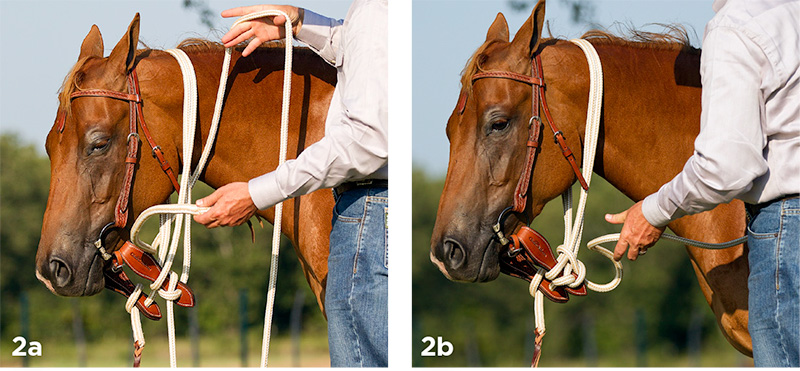STEP 2: Gather the loops under the horse’s neck. Take the end of your lead rope and go around all four lines. Then tuck the end of the lead rope through itself to form a half-hitch (2A and 2B).